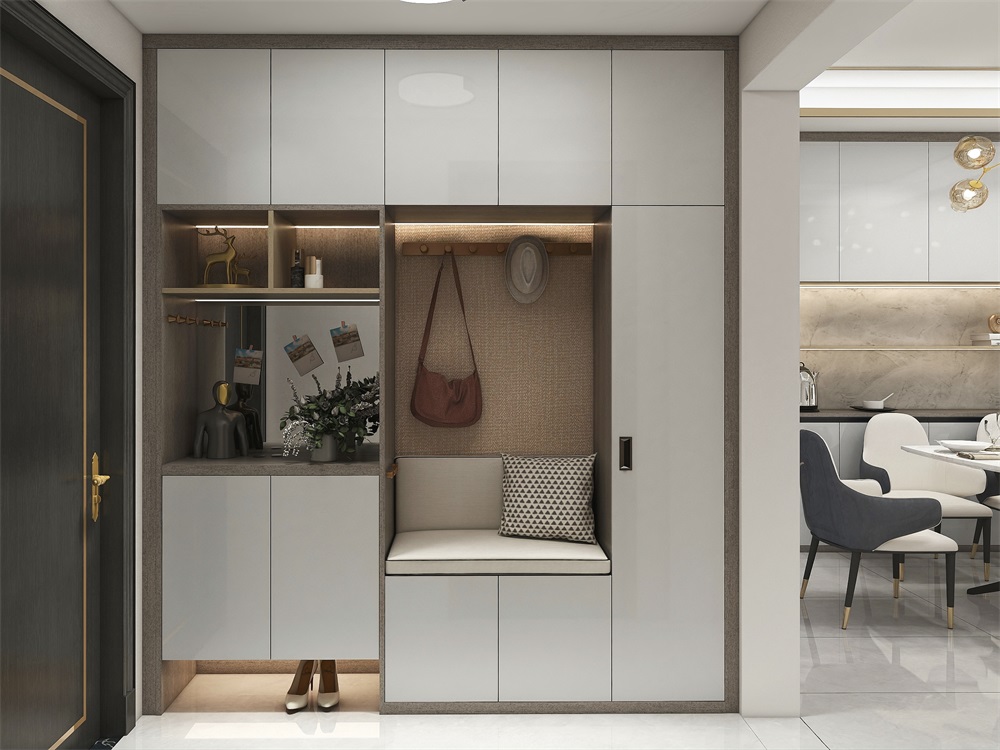 如果進(jìn)門之后有個(gè)拐角,就能把墻面空間利用起來,定制一個(gè)兩面的L型玄關(guān)柜。除了常見的收納功能,還能增加掛衣區(qū)、掛包區(qū)、展示區(qū)、換鞋凳、臺(tái)面收納區(qū)等功能。