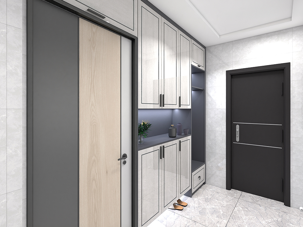 b、如果入戶門位置到了墻角,厚度不夠做鞋柜,還可以把墻面敲掉,做嵌入式鞋柜。